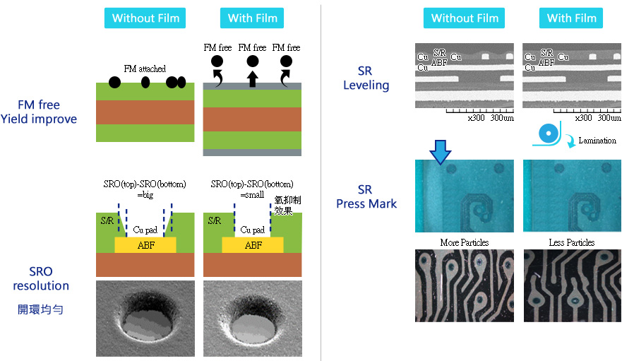 SR 綠漆 ( solder mask ) 油墨專用保護膜,使用於 PCB 多層板在使用綠漆塗佈後,只要使用此系列產品的保護膜,可不需撕下就可以直接曝光,顯影前再撕掉,有效地縮短製程的時間及綠漆的抗氧化,而且可完全避免任何 FM 汙染到綠漆表面 : 綠漆塗佈後的 FM 對策、光澤度、粗糙面、平行度調整等。